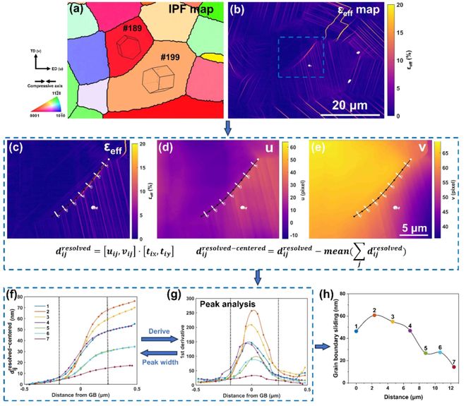 图4为利用HRDIC的位移场信息进行晶界滑动(grain boundary sliding,GBS)定量分析的示例。首先利用峰分析找到目标晶界,随后将其分成若干段,并沿每一小段晶界的中垂线的方向在晶界两侧取点(图4(c)-(e)中的白色圆点)。然后利用图中公式计算每个点的中心化的切向位移,它与点到晶界距离的关系如图4(f)所示。在图中观察到曲线的突变,表明在该处发生了晶界滑动,突变值的大小为晶界滑动值。为了自动获取突变值,对图4(f)中的曲线(g),随后进行峰分析,将峰宽信息赋予图4(f),便可以自动获得突变值(GBS值)。利用该方法,可获得整条晶界上的GBS值分布,如图4(h)所示。以上分析和计算均可通过MATLAB脚本实现自动化。