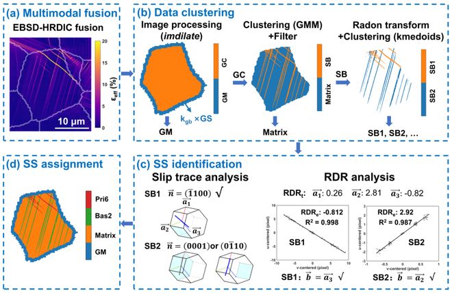 学界很早就认识到金属材料的塑性变形在各个尺度下都是高度局域化(不均匀)的,具体表现为大多数应变集中于滑移带、晶界、剪切带、变形孪晶内。这种应变局域化是影响材料强度及塑性的关键因素,因此受到广泛关注。但是,受限于实验和分析方法,对应变局域化的定量研究还极为欠缺。近些年来,得益于高分辨数字图像相关(high-resolution digital image correlation,HRDIC)技术的提出和发展,获得纳米级分辨率和大视场的全场应变成为可能。但是,HRDIC具有数据量大(通常包含数千万数据点)、信息丰富(包含的位移场、应变场、旋转场等)的特征,这使得手动分析耗时耗力甚至不可能,从而无法有效地利用HRDIC的海量信息。另一方面,多晶材料的塑性变形应包含互相协调竞争的晶内和晶间变形,但目前大多数的HRDIC研究都只关注前者,而忽略了后者。