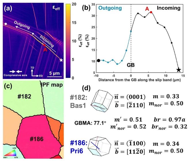 图3展示了此分析框架下滑移转移(一种重要的晶间协调机制)的分析方法。图3(a)为发生滑移转移晶粒对的有效剪切应变图,沿着滑移转移路径提取应变值,可获得滑移转移路径的应变分布曲线(b)),起始点和终止点分别用五角星和圆点在图中标出。因此,根据滑移转移路径的应变分布曲线,以及滑移带形核于应变最高处的假设,可以判断出参与滑移转移的滑移系激活的先后顺序。基于EBSD取向信息(图3(c))获得的滑移转移的关键几何参数在图3(d)中示出,包括滑移面()、滑移方向()、施密特因子(m)、归一化施密特因子(mnor)、几何相容性参数(Luster-Morris参数,m’)、归一化几何相容性参数(mnor’)、残余柏氏矢量大小(br)及归一化残余柏氏矢量大小(rnor)。