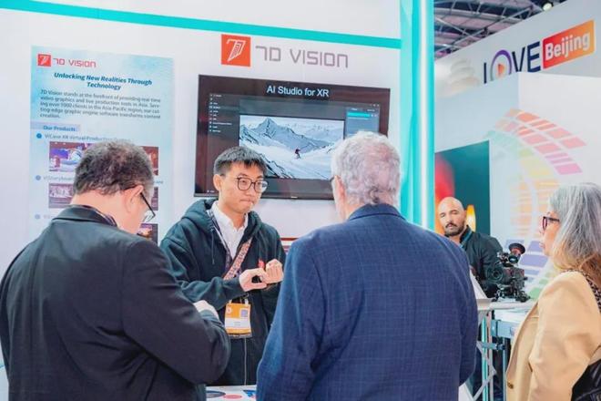 七维视觉的XR沉浸式智能制作播放解决方案与7D AI Studio人工智能生成引擎展示则让国际客商对中国的技术应用有了更深入地了解。在现场演示与体验过程中,国际客商不断与工作人员交流如何使创作者更好地使用全新创作思路,为观众呈现更好的视听体验。