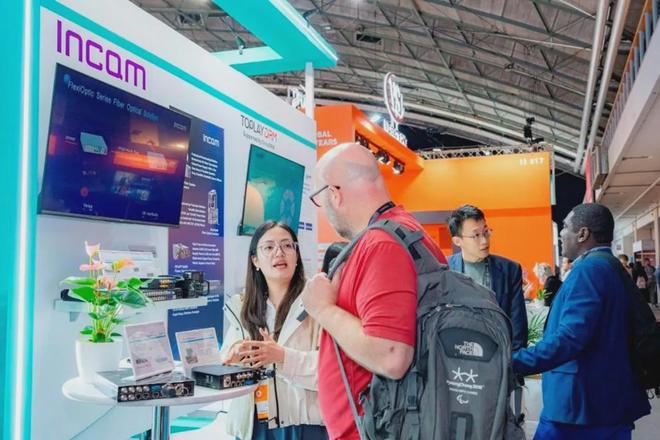 智为科技的IV4K series 电影机讯道后挂系统让电影机秒变讯道摄像机,DockOptic-PTZ 摄控一体机光传输单元的便携式综合光传输特性吸引了诸多国际客商目光。不少前来洽谈合作的PS-EFP远程供电解决方案老客户向工作人员咨询产品性能与应用现状。