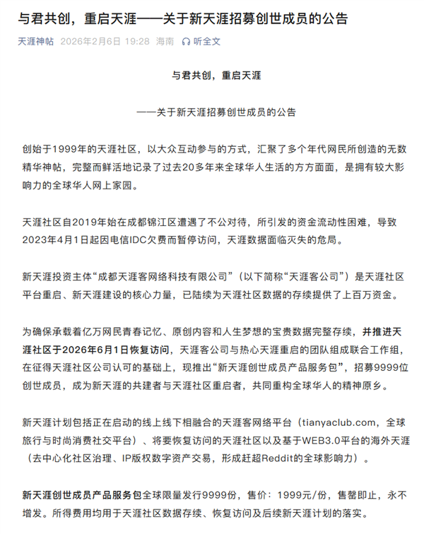 快科技2月7日消息,“天涯神贴”官方公众号发布了一篇《与君共创,重启天涯关于新天涯招募创世成员的公告》。