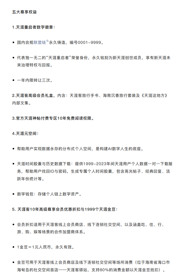 新天涯创世成员产品服务包全球限量发行9999份,售价:1999元/份,售罄即止,永不增发。