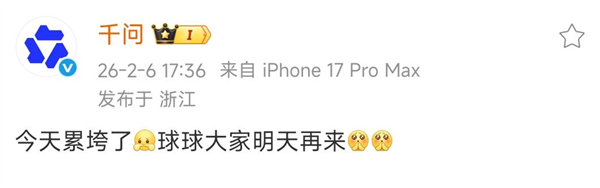 数据显示,当日上线万单。当晚,千问官方微博发文:“今天累垮了,球球大家明天再来。”