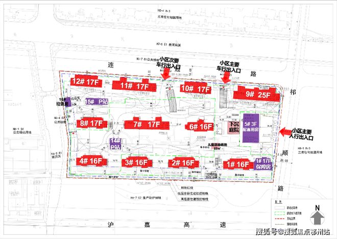 其中1号楼靠近17层的保障房,5号口为3层的配套用房;14#、15#为P站,16#为垃圾用房。