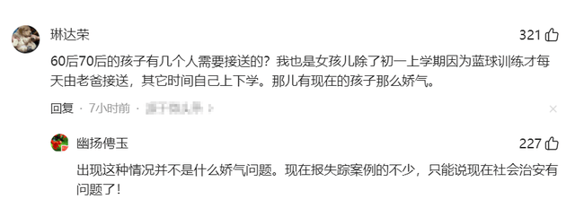 60后70后的孩子有几个人需要接送的?我也是女孩儿除了初一上学期因为篮球训练才每天由老爸接送,其它时间自己上下学。哪儿有现在的孩子那么娇气。