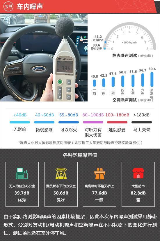 在静态噪声测试环节,长安福特蒙迪欧运动版在静止状态下车内实测噪声值为33.6dB。发动机启动进入怠速工况时,测得噪声值为46.2 dB。由于评测车搭载油电混动系统,未配备转速表,因此无法对发动机在2000转以及3000转时的噪声进行测试。