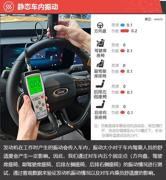 在静态车内振动测试环节,怠速状态下,长安福特蒙迪欧运动版方向盘处的振动数值略高于前后排座椅。负载状态下,虽然所有部位的振动数值均出现小幅升高,但实际体感并不明显。