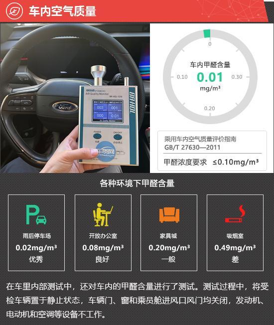 在车内空气质量测试环节,将车辆放置在车辆较少的内部地面停车场中,实测长安福特蒙迪欧运动版的车内甲醛含量为0.01mg/m3,符合2012年3月1日起实施的,由原环保部和国家质量监督检验检疫总局联合发布的《乘用车内空气质量评价指南》(中华人民共和国国家标准GB/T 27630-2011)中的相关标准。